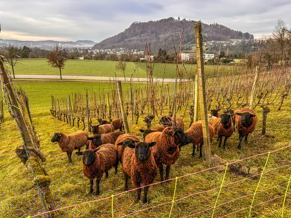 Die rund 20 Schafe haben in unserem Rebberg innert nur einer Woche unser Gras im und rund um unseren Rebberg herum abgefressen.